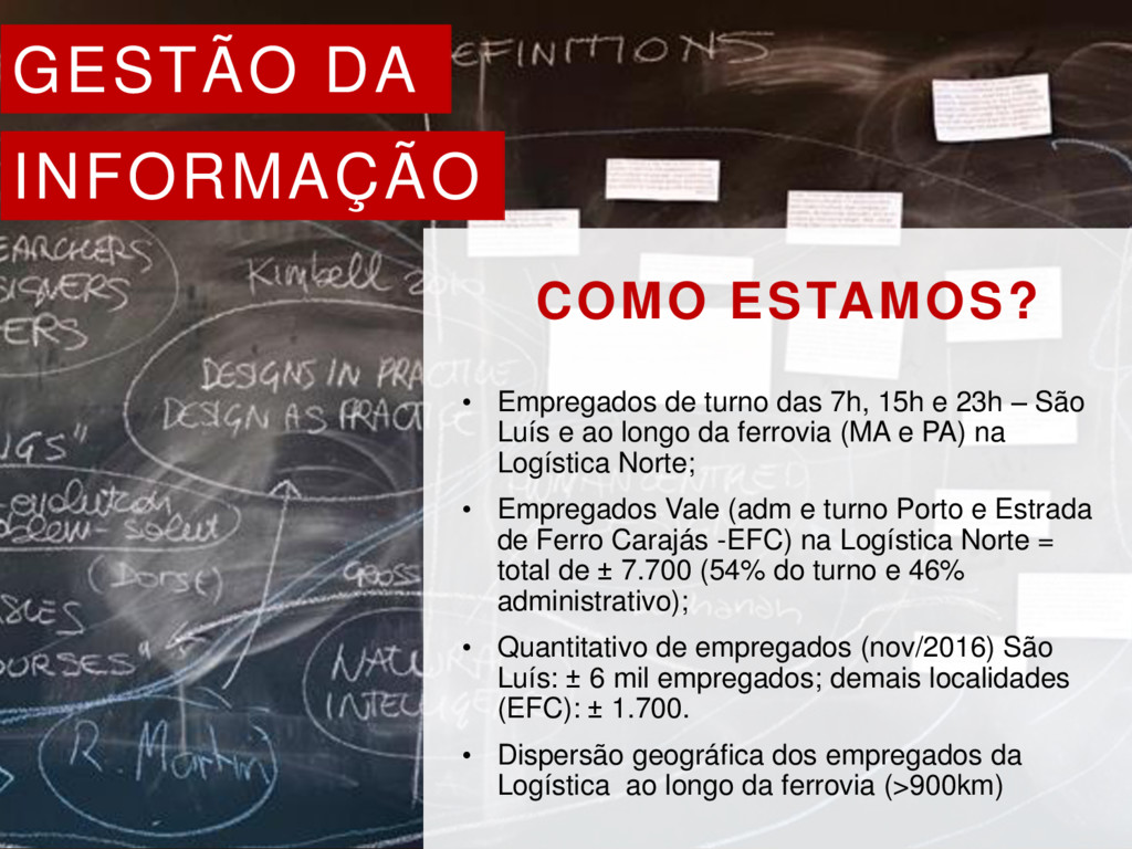 7h, 15h e 23h – São Luís e ao longo da ferrovia (MA e PA) na Logística Norte; • Empregados Vale (adm e turno Porto e Estrada de Ferro Carajás -EFC) na Logística Norte = total de ± 7.700 (54% do turno e 46% administrativo); • Quantitativo de empregados (nov/2016) São Luís: ± 6 mil empregados; demais localidades (EFC): ± 1.700. • Dispersão geográfica dos empregados da Logística ao longo da ferrovia (>900km)