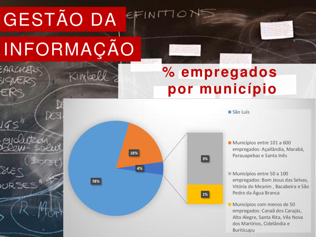 1% 4% São Luís Municípios entre 101 a 600 empregados: Açailândia, Marabá, Parauapebas e Santa Inês Municípios entre 50 a 100 empregados: Bom Jesus das Selvas, Vitória do Mearim , Bacabeira e São Pedro da Água Branca Municípios com menos de 50 empregados: Canaã dos Carajás, Alto Alegre, Santa Rita, Vila Nova dos Martírios, Cidelândia e Buriticupu