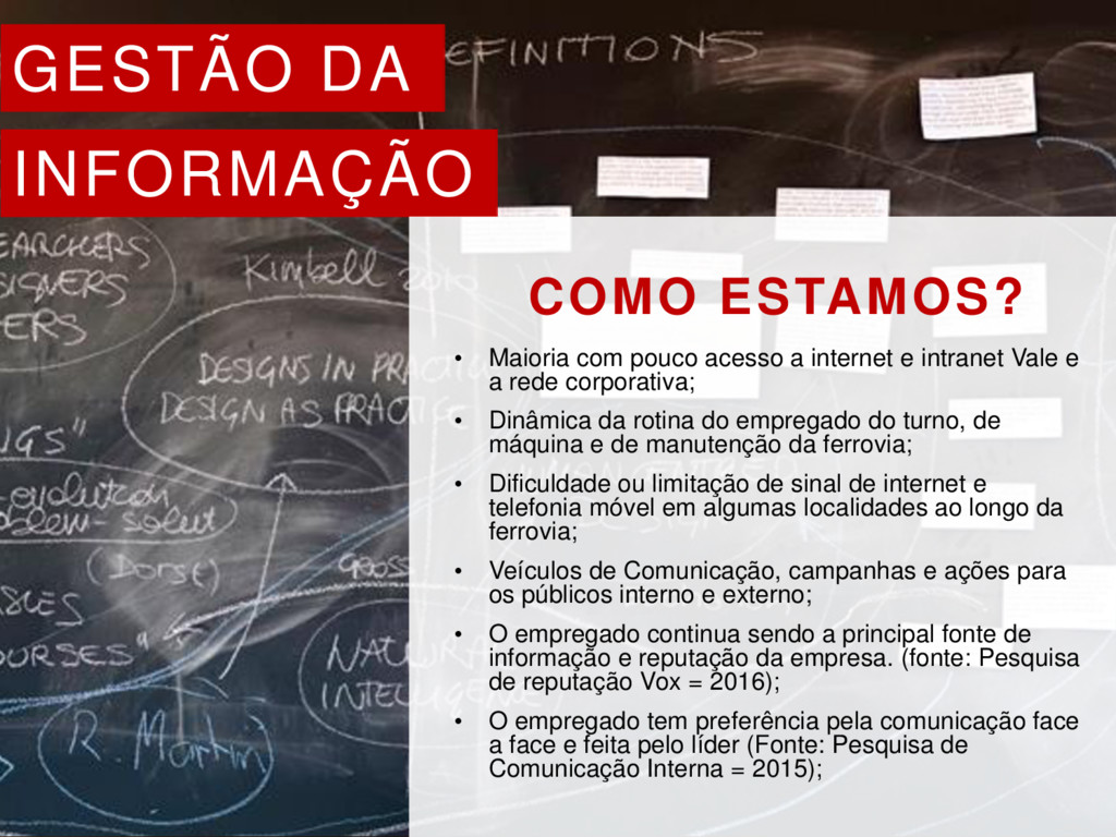 a internet e intranet Vale e a rede corporativa; • Dinâmica da rotina do empregado do turno, de máquina e de manutenção da ferrovia; • Dificuldade ou limitação de sinal de internet e telefonia móvel em algumas localidades ao longo da ferrovia; • Veículos de Comunicação, campanhas e ações para os públicos interno e externo; • O empregado continua sendo a principal fonte de informação e reputação da empresa. (fonte: Pesquisa de reputação Vox = 2016); • O empregado tem preferência pela comunicação face a face e feita pelo líder (Fonte: Pesquisa de Comunicação Interna = 2015);