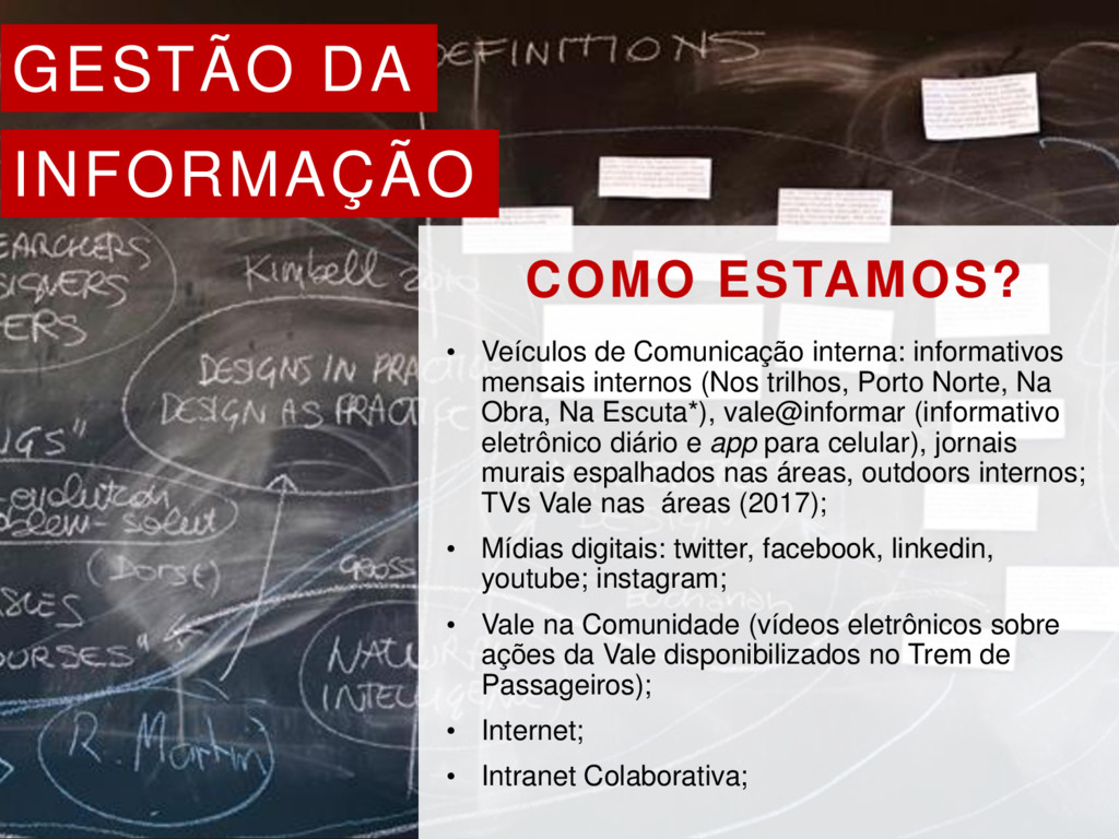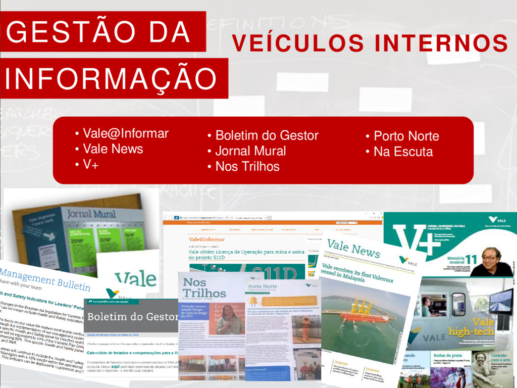 informativos mensais internos (Nos trilhos, Porto Norte, Na Obra, Na Escuta*), vale@informar (informativo eletrônico diário e app para celular), jornais murais espalhados nas áreas, outdoors internos; TVs Vale nas áreas (2017); • Mídias digitais: twitter, facebook, linkedin, youtube; instagram; • Vale na Comunidade (vídeos eletrônicos sobre ações da Vale disponibilizados no Trem de Passageiros); • Internet; • Intranet Colaborativa;