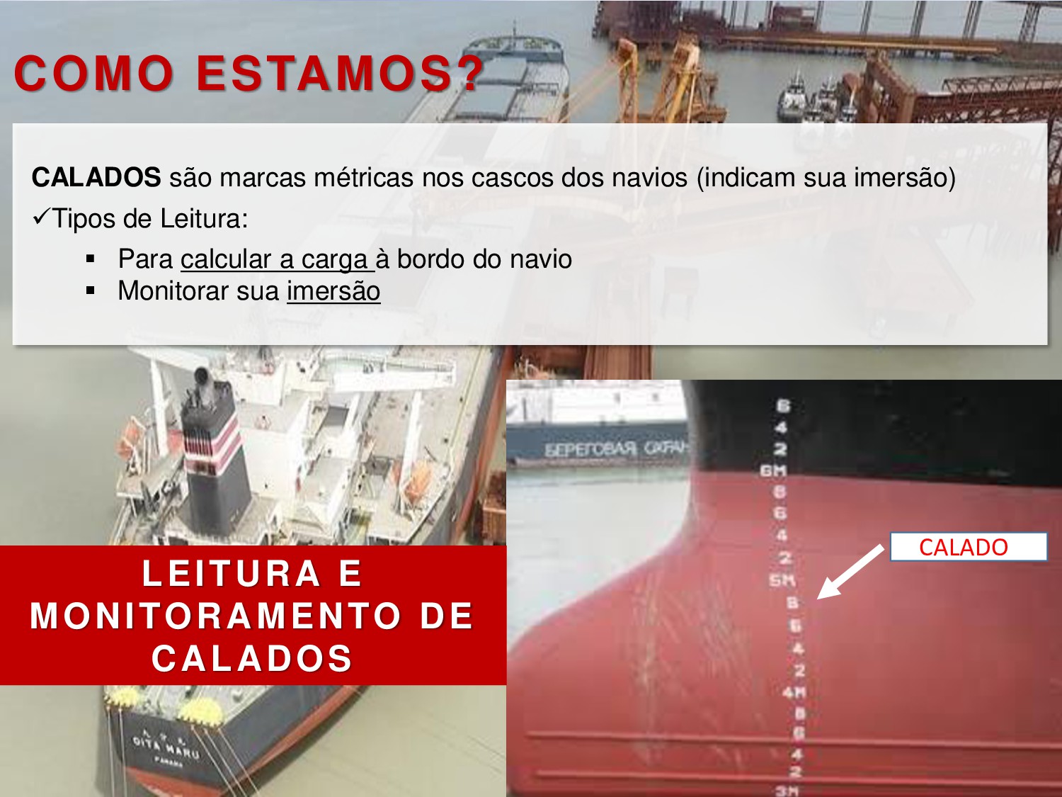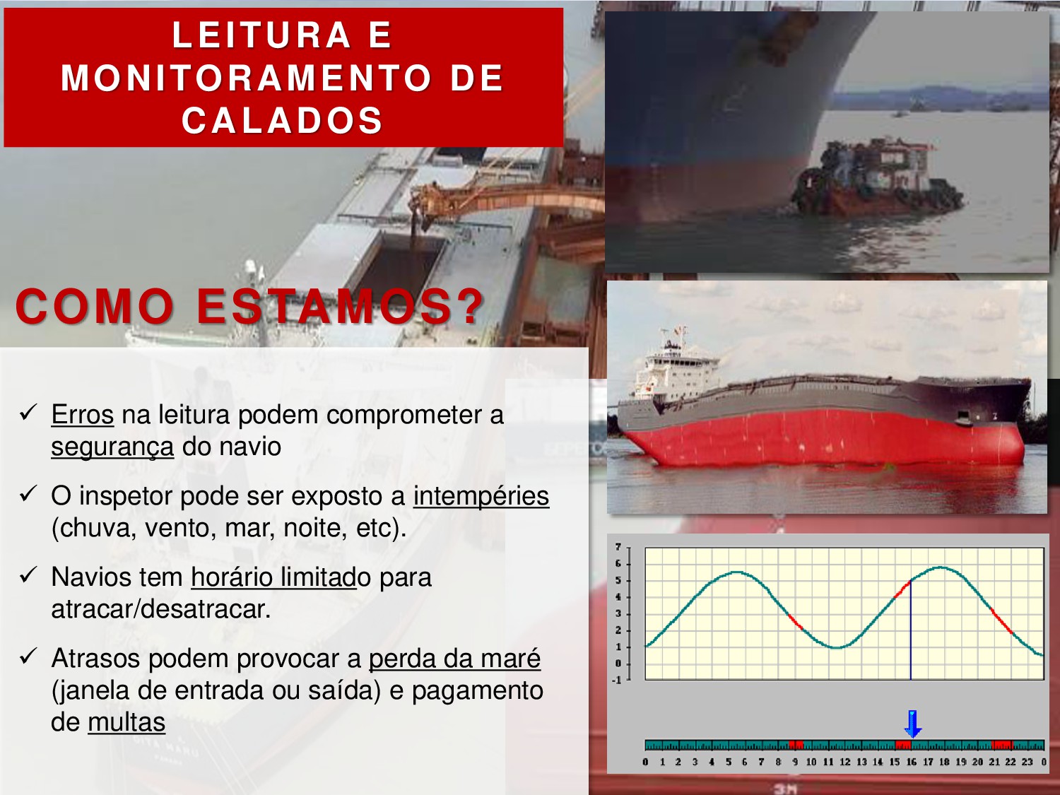 O inspetor pode ser exposto a intempéries (chuva, vento, mar, noite, etc). Navios tem horário limitado para atracar/desatracar. Atrasos podem provocar a perda da maré (janela de entrada ou saída) e pagamento de multas COMO ESTAMOS? LEITURA E MONITORAMENTO DE CALADOS