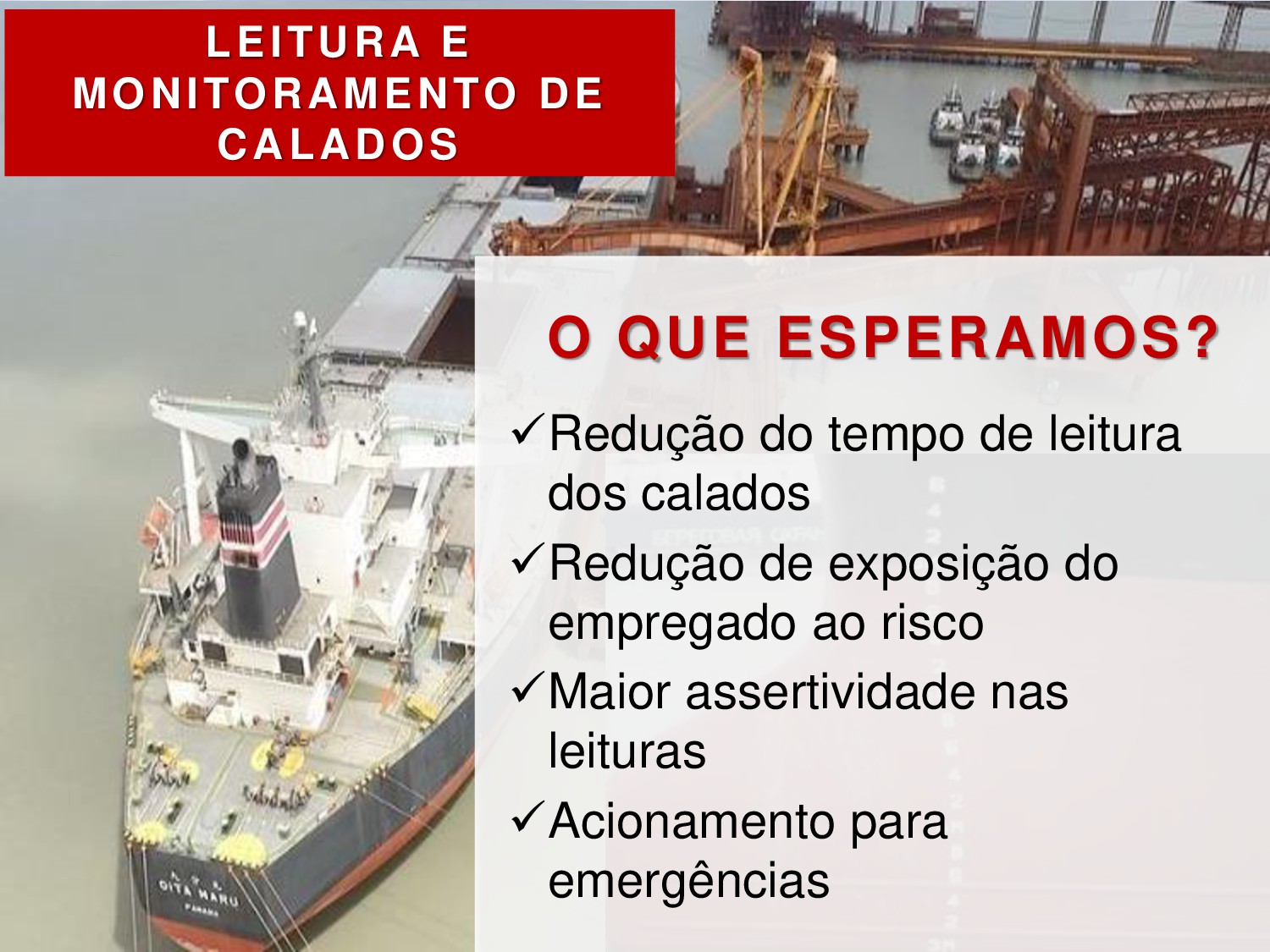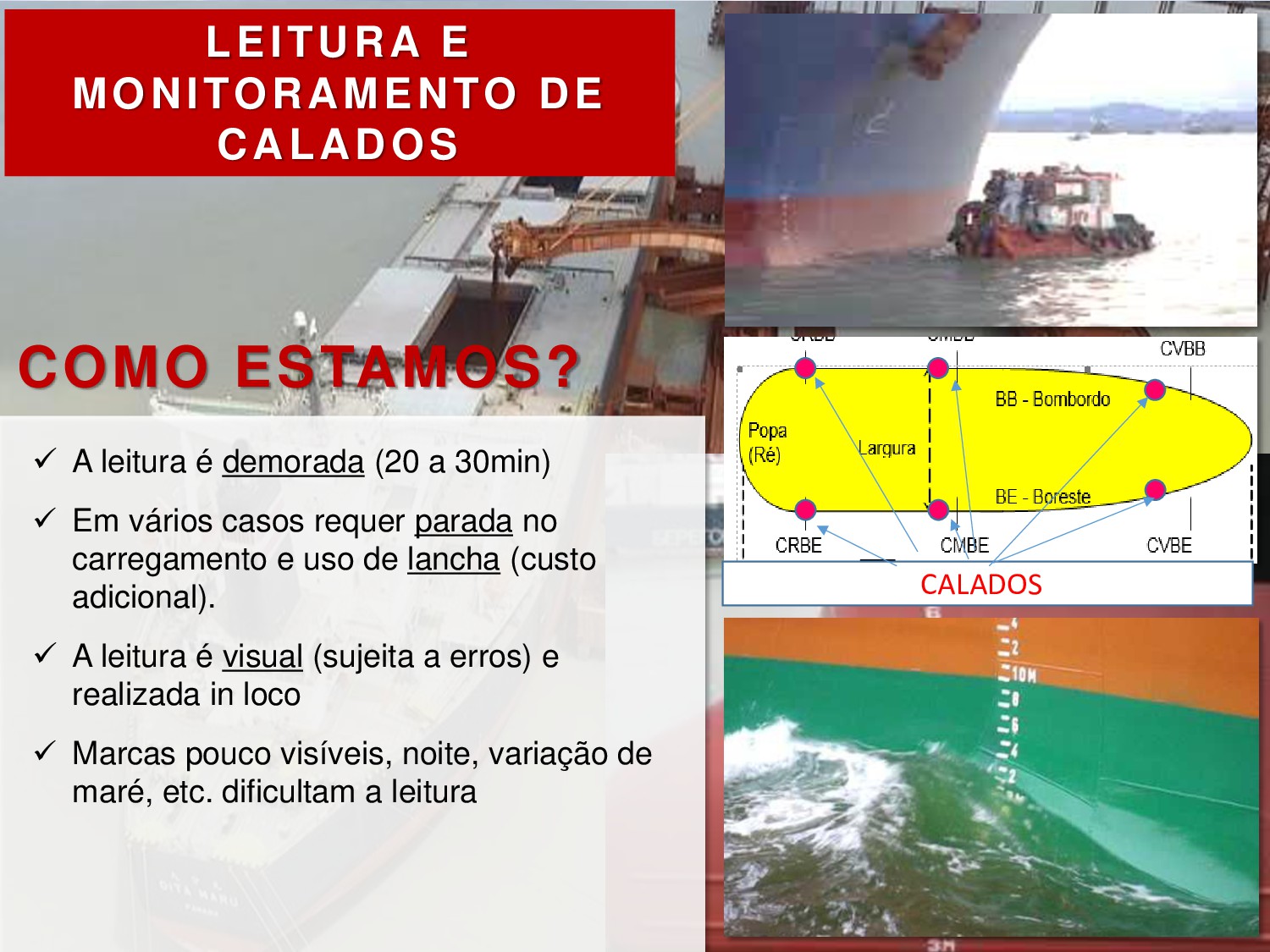 Em vários casos requer parada no carregamento e uso de lancha (custo adicional). A leitura é visual (sujeita a erros) e realizada in loco Marcas pouco visíveis, noite, variação de maré, etc. dificultam a leitura CALADOSs LEITURA E MONITORAMENTO DE CALADOS