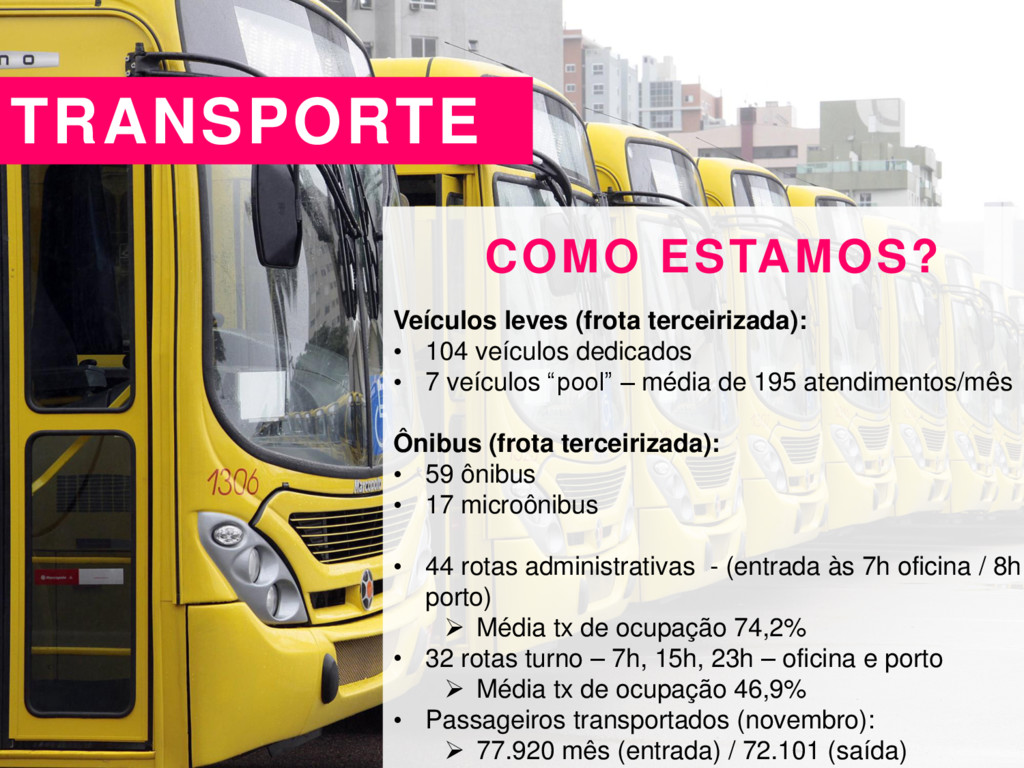 7 veículos “pool” – média de 195 atendimentos/mês Ônibus (frota terceirizada): • 59 ônibus • 17 microônibus • 44 rotas administrativas - (entrada às 7h oficina / 8h porto) Média tx de ocupação 74,2% • 32 rotas turno – 7h, 15h, 23h – oficina e porto Média tx de ocupação 46,9% • Passageiros transportados (novembro): 77.920 mês (entrada) / 72.101 (saída) COMO ESTAMOS?