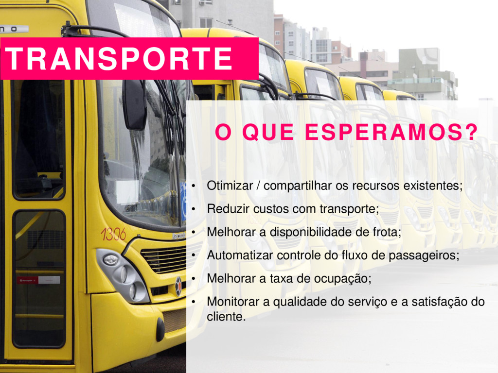 custos com transporte; • Melhorar a disponibilidade de frota; • Automatizar controle do fluxo de passageiros; • Melhorar a taxa de ocupação; • Monitorar a qualidade do serviço e a satisfação do cliente. O QUE ESPERAMOS?