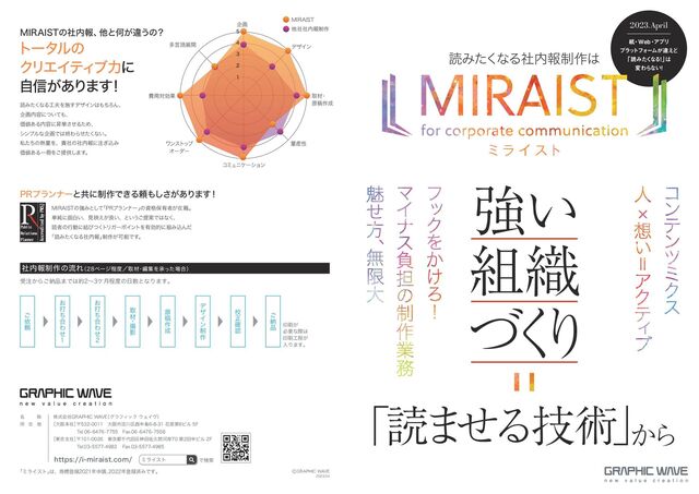 ウェイヴ) 所 在 地 [大阪本社] 〒532-0011 大阪市淀川区西中島6-8-31 花原第6ビル 5F Tel.06-6476-7755 Fax.06-6476-7558 [東京支社] 〒101-0026 東京都千代田区神田佐久間河岸70 第2田中ビル 2F Tel.03-5577-4983 Fax.03-5577-4985 https://i-miraist.com/ MIRAISTの社内報、 他と何が違うの? トータルの ク リエイティ ブ力に 自信があります ! PRプランナーと共に制作できる頼もしさがあります ! 「ミライスト」 は、商標登録2021年申請、 2022年登録済みです。 ◦ C GRAPHIC WAVE 2023.04 受注からご納品までは約2〜3ケ月程度の日数となります。 社内報制作の流れ (28ページ程度/取材 ・ 編集を承った場合) ご 依 頼 お 打 ち 合 わ せ 2 取 材 ・ 撮 影 原 稿 作 成 お 打 ち 合 わ せ 1 校 正 確 認 デ ザ イ ン 制 作 ご 納 品 印刷が 必要な際は 印刷工程が 入ります。 ミライスト で検索 読みたくなる工夫を施すデザインはもちろん、 企画内容についても、 価値ある内容に昇華させるため、 シンプルな企画では終わらせたくない。 私たちの熱量を、貴社の社内報に注ぎ込み 価値ある一冊をご提供します。 強い 組織 づ く り から 「読ま せる技術」 読みたくなる社内報制作は 企画 デザイン 取材 ・ 原稿作成 量産性 ワンストッ プ オーダー 他社社内報制作 コミュニケーション MIRAISTの強みとして 「PRプランナー」 の資格保有者が在籍。 単純に面白い、見映えが良い、というご提案ではなく、 読者の行動に結びつく トリガーポイントを有効的に組み込んだ 「読みたくなる社内報」 制作が可能です。 多言語展開 費用対効果 紙 ・Web・ アプリ プラ ッ トフ ォ ームが違え ど 「読みた く なる!」 は 変わら ない ! 2023.April MIRAIST