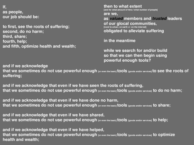 the roots of suffering; second, do no harm; third, share; fourth, help; and fifth, optimize health and wealth; and if we acknowledge that we sometimes do not use powerful enough [or even the basic] tools [goods and/or services] to see the roots of suffering; and if we acknowledge that even if we have seen the roots of suffering, that we sometimes do not use powerful enough [or even the basic] tools [goods and/or services] to do no harm; and if we acknowledge that even if we have done no harm, that we sometimes do not use powerful enough [or even the basic] tools [goods and/or services] to share; and if we acknowledge that even if we have shared, that we sometimes do not use powerful enough [or even the basic] tools [goods and/or services] to help; and if we acknowledge that even if we have helped, that we sometimes do not use powerful enough [or even the basic] tools [goods and/or services] to optimize health and wealth; then to what extent [and for what amount of time / what number of people] are we, as valued members and trusted leaders of our glocal communities, [rural to urban; on earth +/- on the internet] obligated to alleviate suffering in the meantime while we search for and/or build so that we can then begin using powerful enough tools?