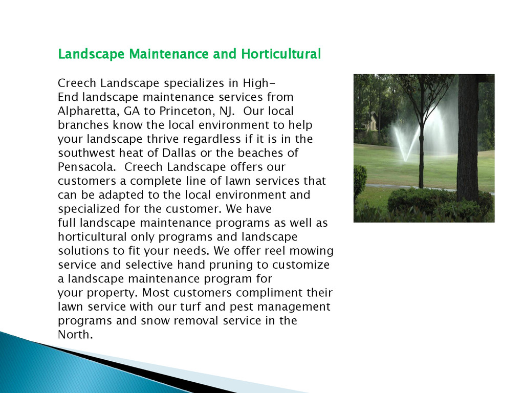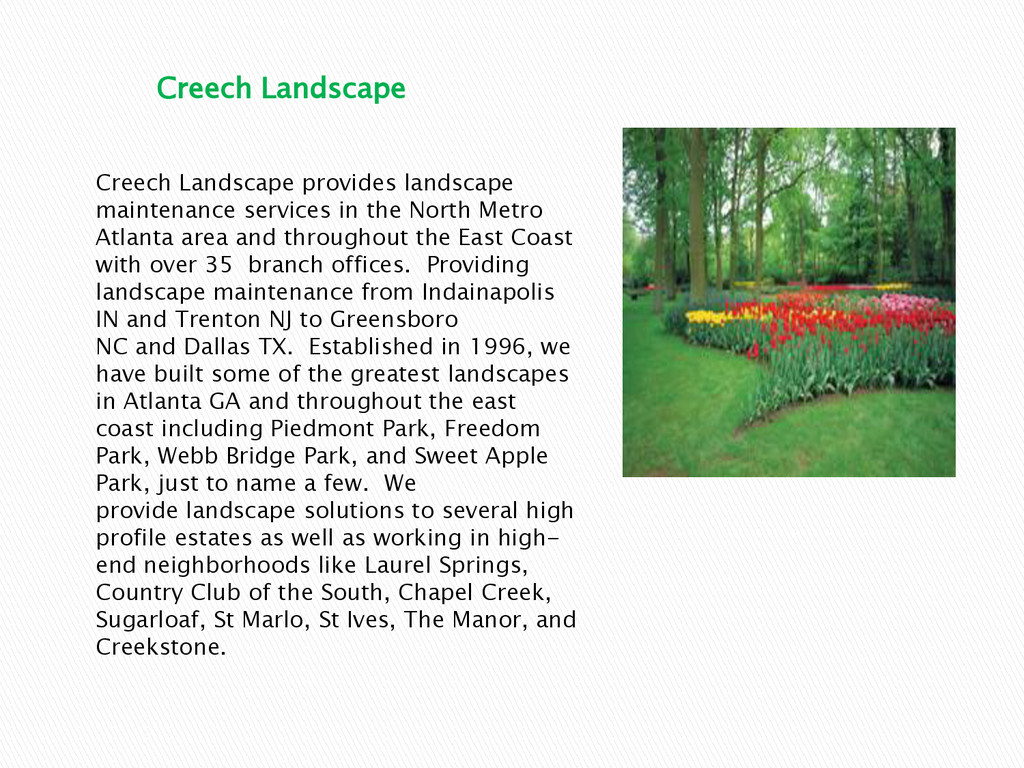 Creech Landscape headquartered Alpharetta GA is a national landscape company that has been landscaping Atlanta and the Southeast for over 16 years, offering landscape solutions. We focus on high-end landscape maintenance, lawn services, and lawn care for commercial and residential properties. We are committed to providing the best landscape maintenance services to our customers.