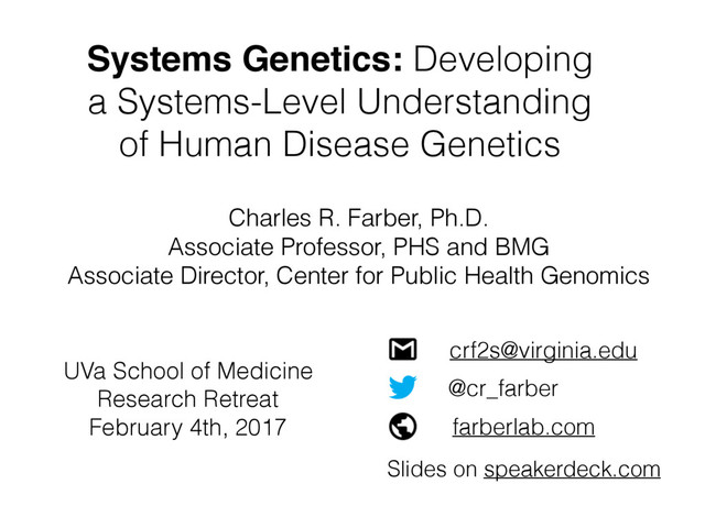 Charles R. Farber, Ph.D. Associate Professor, PHS and BMG Associate Director, Center for Public Health Genomics @cr_farber [email protected] farberlab.com UVa School of Medicine Research Retreat February 4th, 2017 Slides on speakerdeck.com