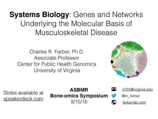 Presentation at the ASBMR 2016 Pre-Meeting symposium on "bone -omics" in Atlanta, Georgia on 9/15/16 entitled "Systems Biology: Genes and Networks Underlying the Molecular Basis of Musculoskeletal Disease"