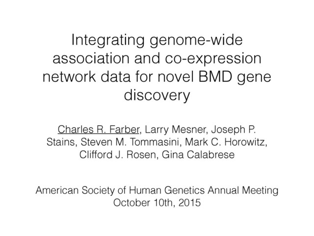 gene discovery Charles R. Farber, Larry Mesner, Joseph P. Stains, Steven M. Tommasini, Mark C. Horowitz, Clifford J. Rosen, Gina Calabrese American Society of Human Genetics Annual Meeting October 10th, 2015