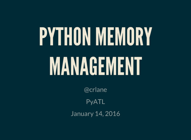 These slides are from a talk I gave at PyATL on January 14, 2016. It is the compilation of many freely available sources on how python deals with memory, and I have cited the work of others where applicable (see references section).