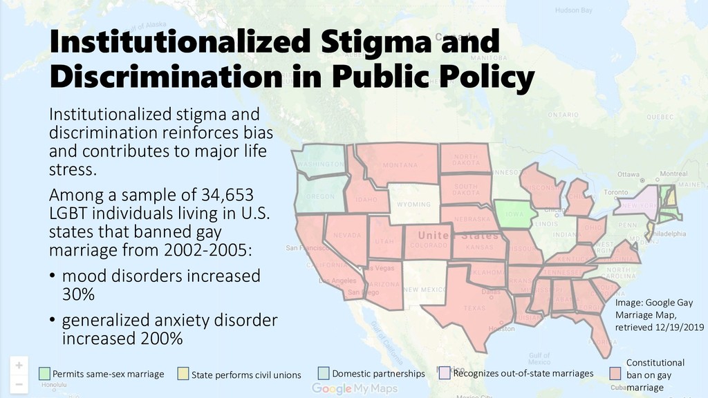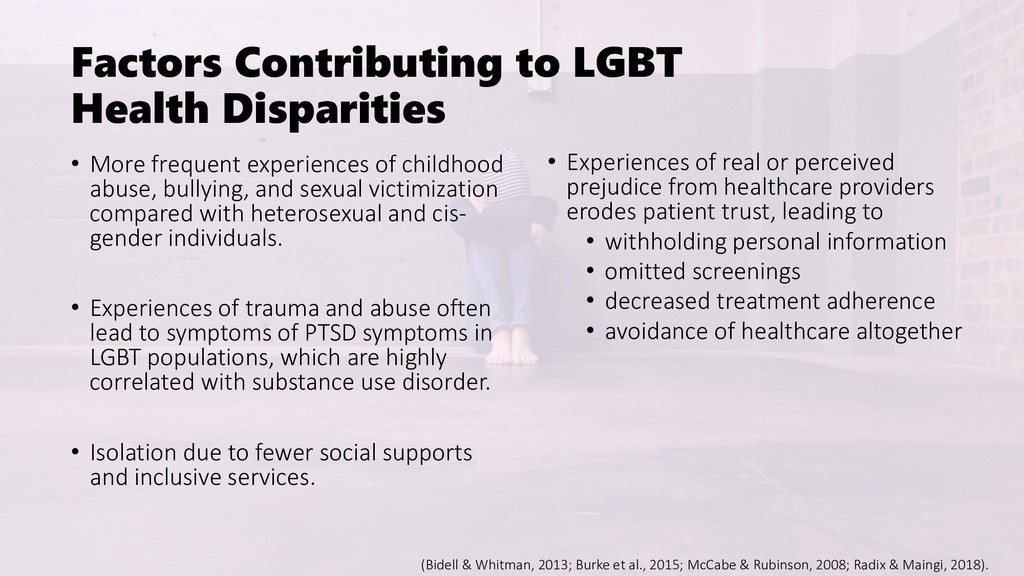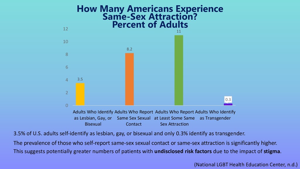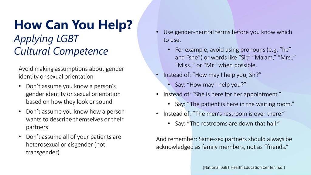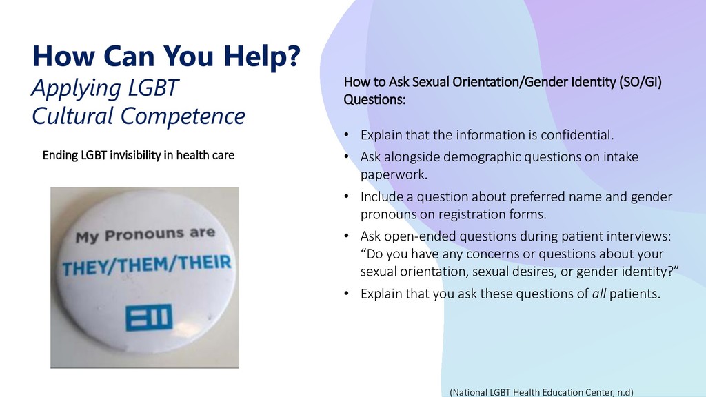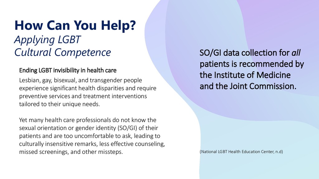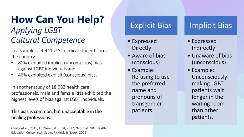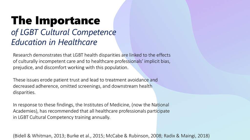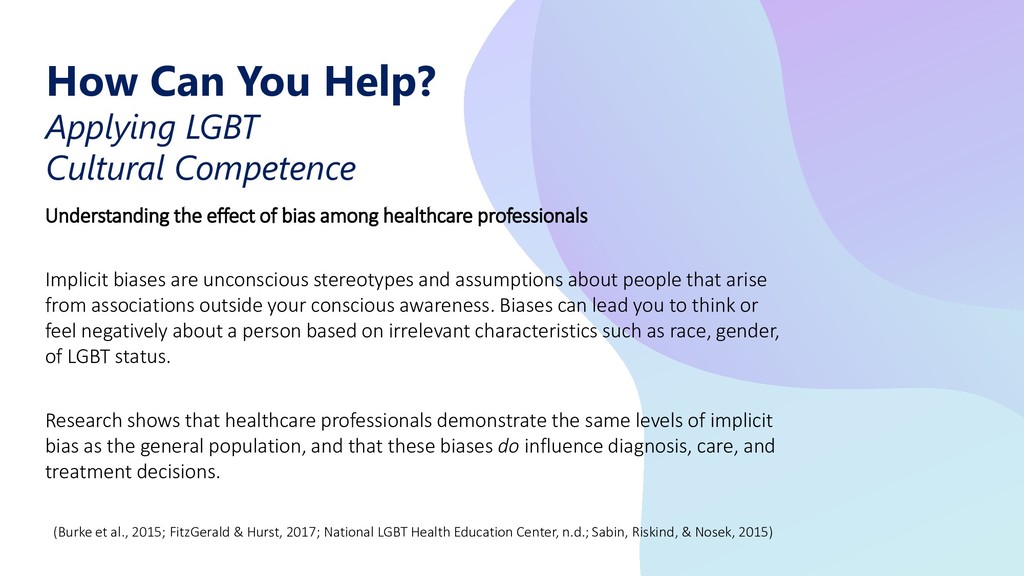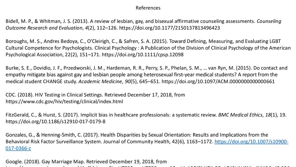 review of lesbian, gay, and bisexual affirmative counseling assessments. Counseling Outcome Research and Evaluation, 4(2), 112–126. https://doi.org/10.1177/2150137813496423 Boroughs, M. S., Andres Bedoya, C., O’Cleirigh, C., & Safren, S. A. (2015). Toward Defining, Measuring, and Evaluating LGBT Cultural Competence for Psychologists. Clinical Psychology : A Publication of the Division of Clinical Psychology of the American Psychological Association, 22(2), 151–171. https://doi.org/10.1111/cpsp.12098 Burke, S. E., Dovidio, J. F., Przedworski, J. M., Hardeman, R. R., Perry, S. P., Phelan, S. M., … van Ryn, M. (2015). Do contact and empathy mitigate bias against gay and lesbian people among heterosexual first-year medical students? A report from the medical student CHANGE study. Academic Medicine, 90(5), 645–651. https://doi.org/10.1097/ACM.0000000000000661 CDC. (2018). HIV Testing in Clinical Settings. Retrieved December 17, 2018, from https://www.cdc.gov/hiv/testing/clinical/index.html FitzGerald, C., & Hurst, S. (2017). Implicit bias in healthcare professionals: a systematic review. BMC Medical Ethics, 18(1), 19. https://doi.org/10.1186/s12910-017-0179-8 Gonzales, G., & Henning-Smith, C. (2017). Health Disparities by Sexual Orientation: Results and Implications from the Behavioral Risk Factor Surveillance System. Journal of Community Health, 42(6), 1163–1172. https://doi.org/10.1007/s10900- 017-0366-z Google. (2018). Gay Marriage Map. Retrieved December 19, 2018, from