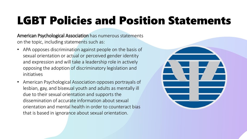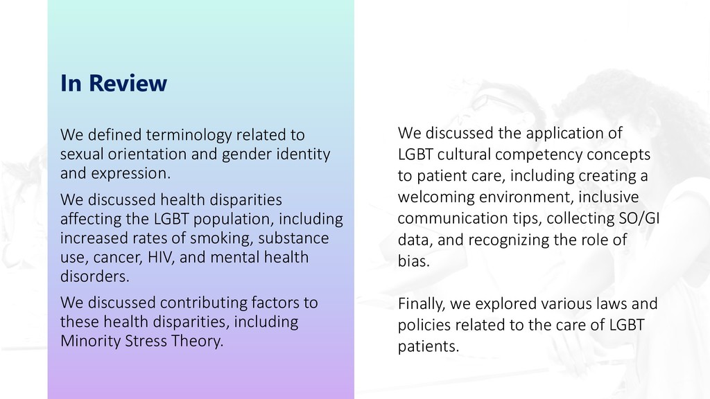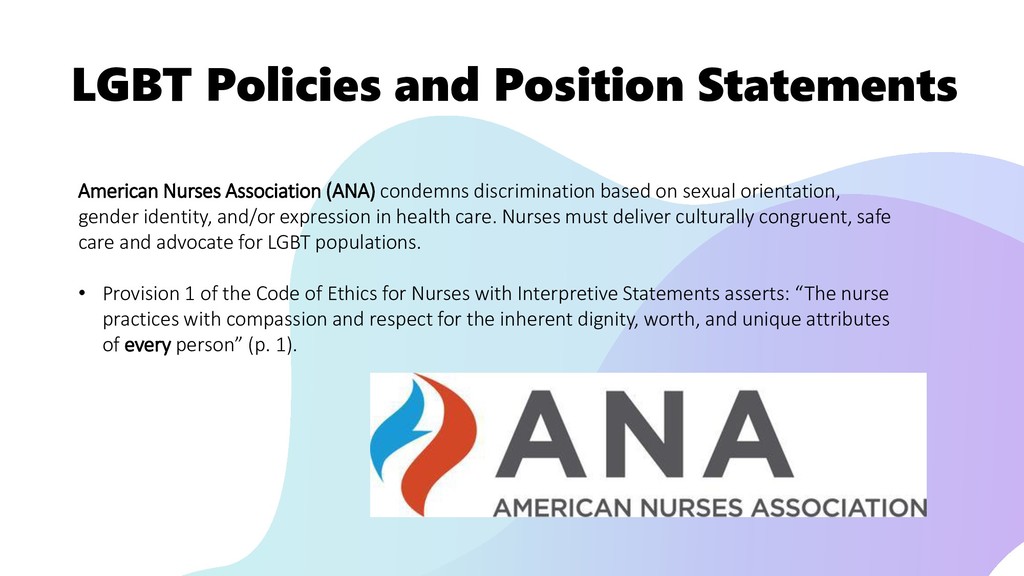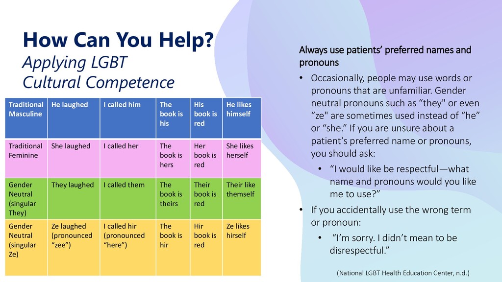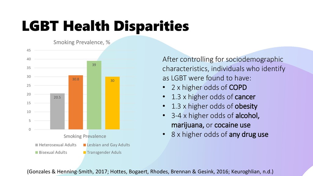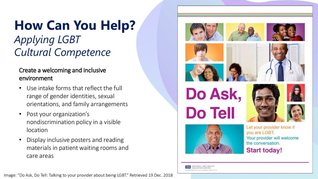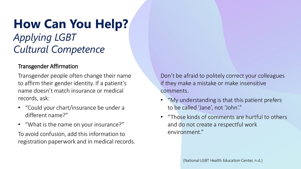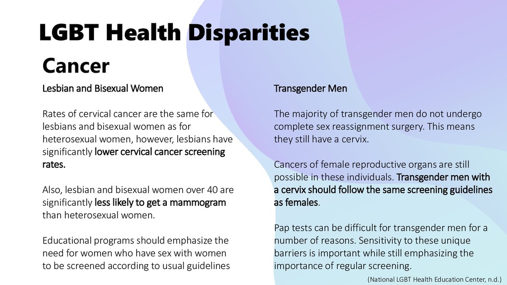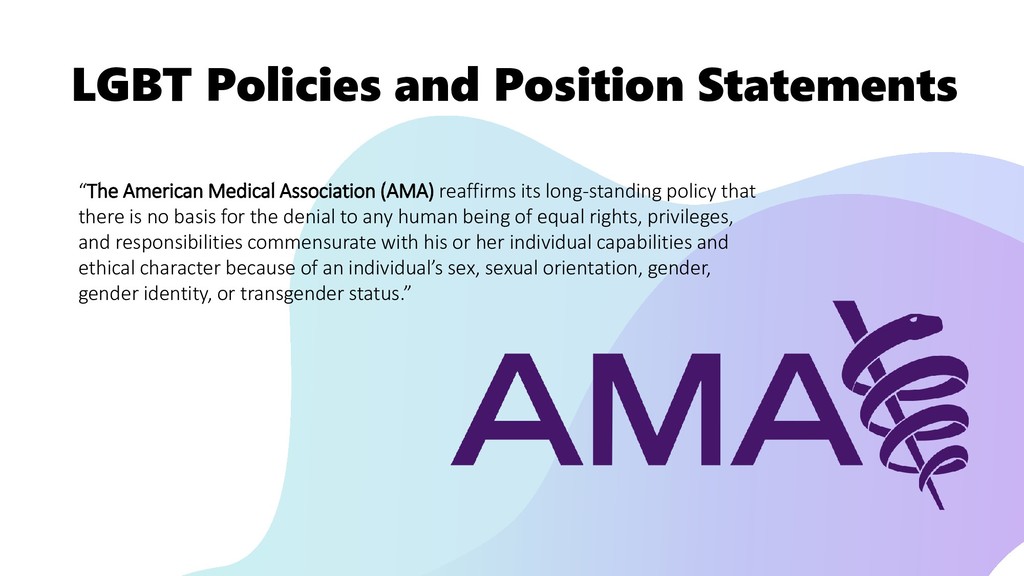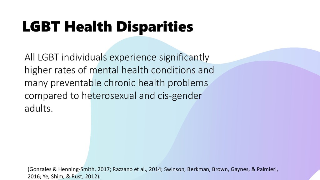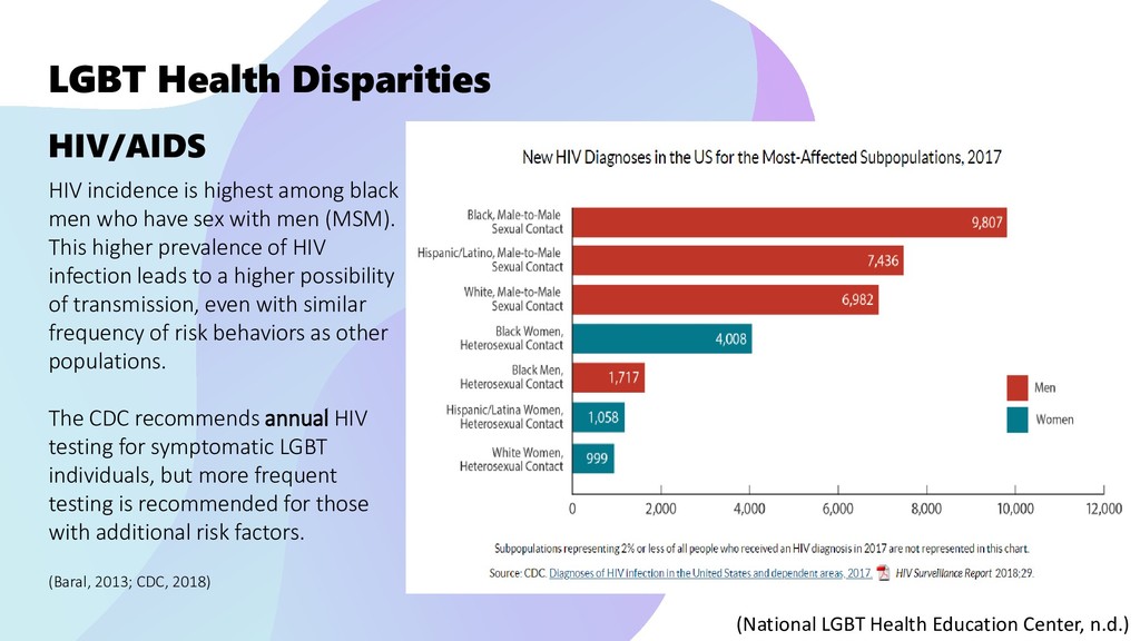 review of lesbian, gay, and bisexual affirmative counseling assessments. Counseling Outcome Research and Evaluation, 4(2), 112–126. https://doi.org/10.1177/2150137813496423 Boroughs, M. S., Andres Bedoya, C., O’Cleirigh, C., & Safren, S. A. (2015). Toward Defining, Measuring, and Evaluating LGBT Cultural Competence for Psychologists. Clinical Psychology : A Publication of the Division of Clinical Psychology of the American Psychological Association, 22(2), 151–171. https://doi.org/10.1111/cpsp.12098 Burke, S. E., Dovidio, J. F., Przedworski, J. M., Hardeman, R. R., Perry, S. P., Phelan, S. M., … van Ryn, M. (2015). Do contact and empathy mitigate bias against gay and lesbian people among heterosexual first-year medical students? A report from the medical student CHANGE study. Academic Medicine, 90(5), 645–651. https://doi.org/10.1097/ACM.0000000000000661 CDC. (2018). HIV Testing in Clinical Settings. Retrieved December 17, 2018, from https://www.cdc.gov/hiv/testing/clinical/index.html FitzGerald, C., & Hurst, S. (2017). Implicit bias in healthcare professionals: a systematic review. BMC Medical Ethics, 18(1), 19. https://doi.org/10.1186/s12910-017-0179-8 Gonzales, G., & Henning-Smith, C. (2017). Health Disparities by Sexual Orientation: Results and Implications from the Behavioral Risk Factor Surveillance System. Journal of Community Health, 42(6), 1163–1172. https://doi.org/10.1007/s10900- 017-0366-z Google. (2018). Gay Marriage Map. Retrieved December 19, 2018, from