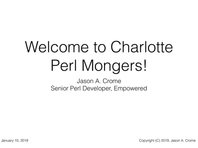 Welcome to Charlotte Perl Mongers! Jason A. Crome Senior Perl
