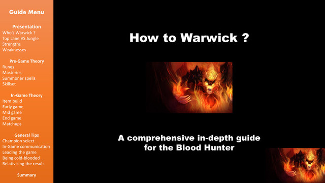 Scenario 2 – "Anything else" Answer : Ward your red and start blue. How to recognize this situation : They will most likely invade your red because their jungle is energy based and people don’t understand the value of the blue buff (Lee, Shyvana, …) They have a worse level 1 (Soraka, Ryze, Nidalee, …) Their jungler might try to kill you on red after his blue start (Lee, J4, Hecarim, Vi, …) Guide Menu Presentation Who’s Warwick ? Top Lane VS Jungle Strengths Weaknesses Pre-Game Theory Runes Masteries Summoner spells Skillset In-Game Theory Item build Early game Mid game End game Matchups General Tips Champion select In-Game communication Leading the game Being cold-blooded Relativising the result Summary