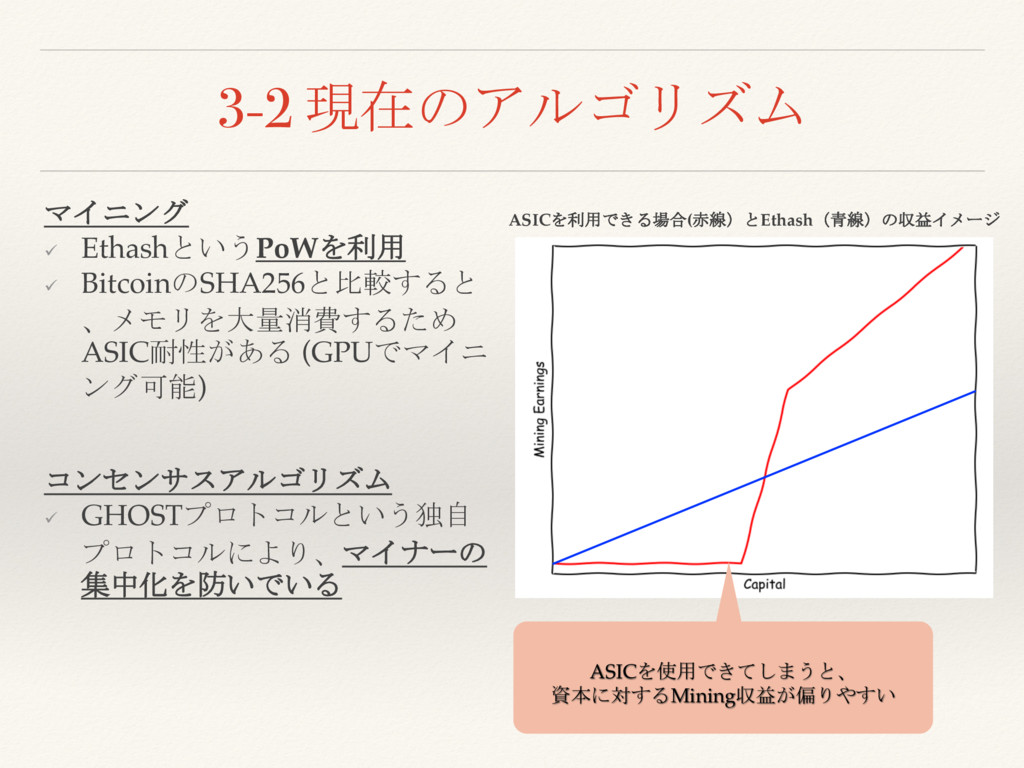 ング可能) コンセンサスアルゴリズム ü GHOSTプロトコルという独自 プロトコルにより、マイナーの 集中化を防いでいる ASICを利用できる場合(赤線)とEthash(青線)の収益イメージ ASICを使用できてしまうと、 資本に対するMining収益が偏りやすい