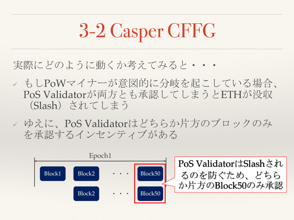 3-2 Casper CFFG 実際にどのように動くか考えてみると・・・ ü もしPoWマイナーが意図的に分岐を起こしている場合、 PoS Validatorが両方とも承認してしまうとETHが没収 (Slash)されてしまう ü