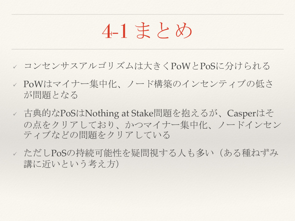 4-1 まとめ ü コンセンサスアルゴリズムは大きくPoWとPoSに分けられる ü PoWはマイナー集中化、ノード構築のインセンティブの低さ が問題となる ü 古典的なPoSはNothing at