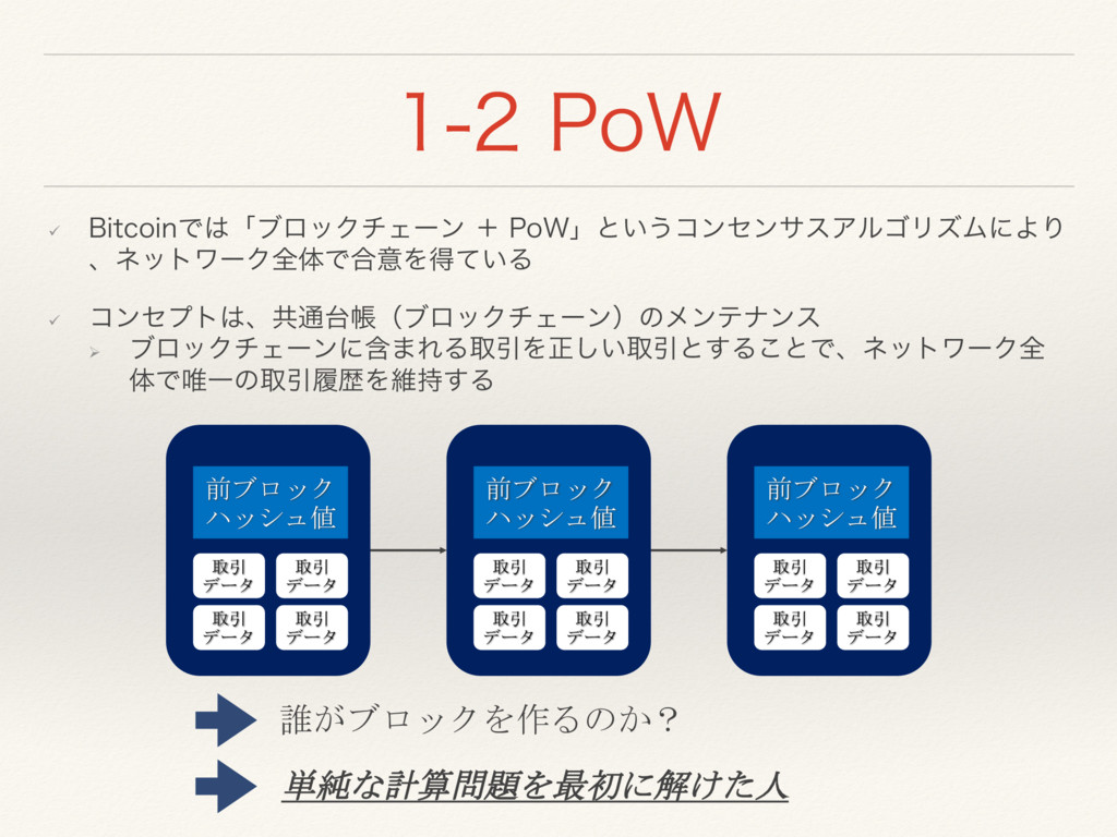 ମͰ།ҰͷऔҾཤྺΛҡ࣋͢Δ 誰がブロックを作るのか? 単純な計算問題を最初に解けた人 前ブロック ハッシュ値 取引 データ 取引 データ 取引 データ 取引 データ 前ブロック ハッシュ値 取引 データ 取引 データ 取引 データ 取引 データ 前ブロック ハッシュ値 取引 データ 取引 データ 取引 データ 取引 データ
