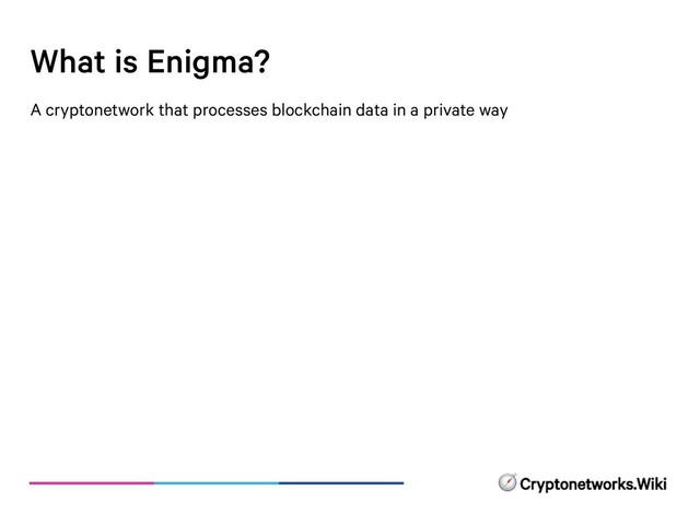 data • Enigma splits the data up across many Private Computers in the network • the Private Computers never see the whole data. This means that the data stay private throughout. • the data is only distributed to some Private Computers, not all of them. This means that the data processing is much faster than on a normal blockchain.