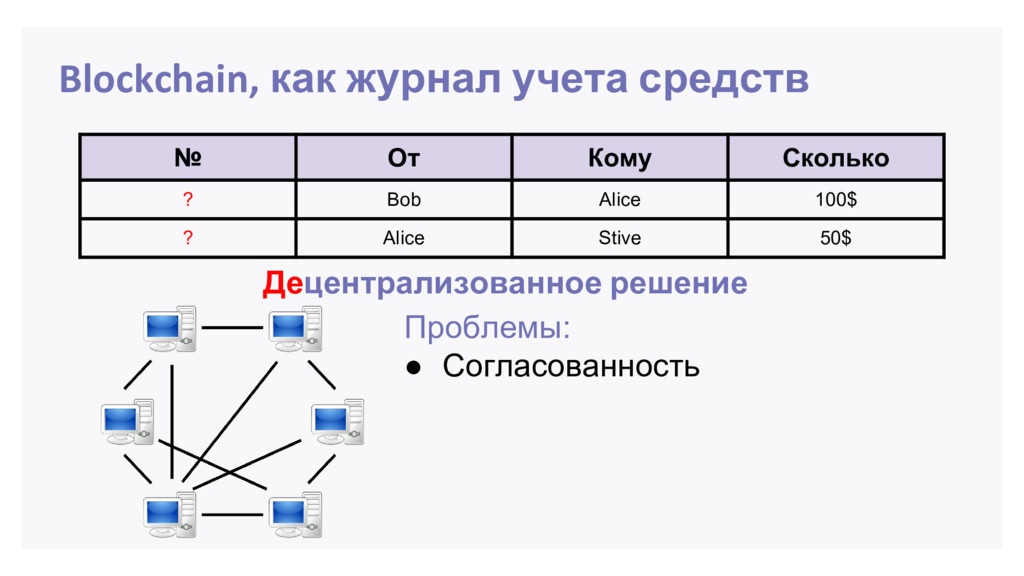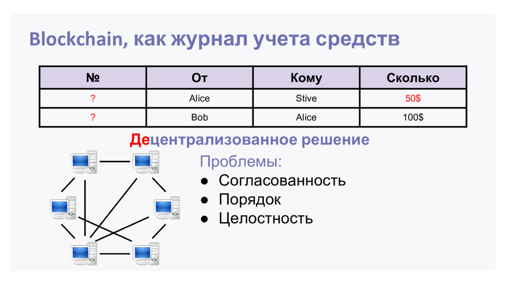 Bob (0x1a5d20e3957fd) Alice (0xAFBfA318aF5d) 100$ 0xcd8622efb ? Alice (0xAFBfA318aF5d) Stive (0x6e8f8b1945a37) 50$ 0xb1945a374 № От Кому Сумма ? Bob Alice 100$ ? Alice Stive 50$ • Имена -> адреса • Подпись транзакции • Проверка подписи