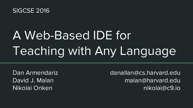 Tour of its features 2. Assignments a. Adapting and writing assignments b. Limitations and technical considerations 3. Developing customizations with plugin API a. Architecture overview b. API, documentation, plugin examples c. Develop your first C9 plugin!