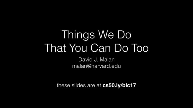 students at Yale College • 300 students at Harvard Extension • CS50x • 1M+ registrants • Kansas City, Miami, Rhode Island, St. Louis, ... • Bolivia, Burma, Chile, Netherlands, Nicaragua, UK, Ukraine, ... • CS50 AP • 150 high schools • 5,000 students • CS50 for MBAs • 100 students at Harvard Business School