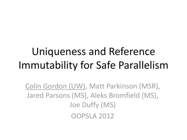prototype C# extension in active use at Microsoft. • Some differences from formal system o e.g. first-class tasks, unstrict blocks • Millions of lines of code • Most parallelism checked o 100% within a couple weeks • Anecdotally: More RI finds more bugs o Races found before safe parallelism was turned on