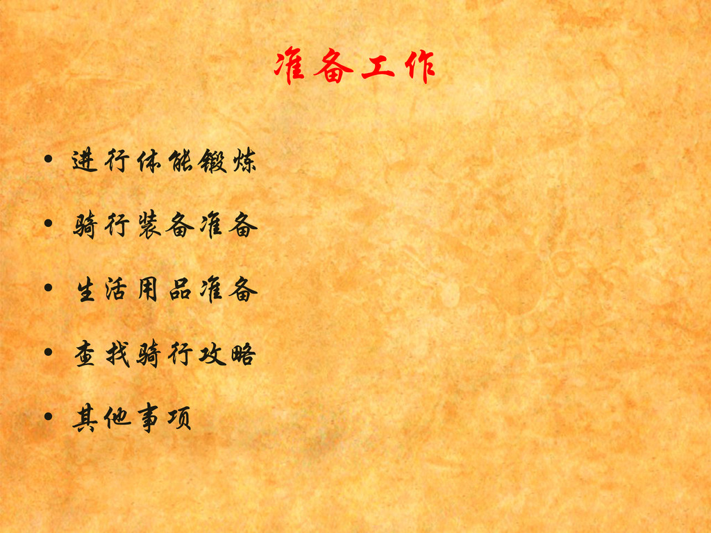 准备工作 • 进行体能锻炼 • 骑行装备准备 • 生活用品准备 • 查找骑行攻略 •