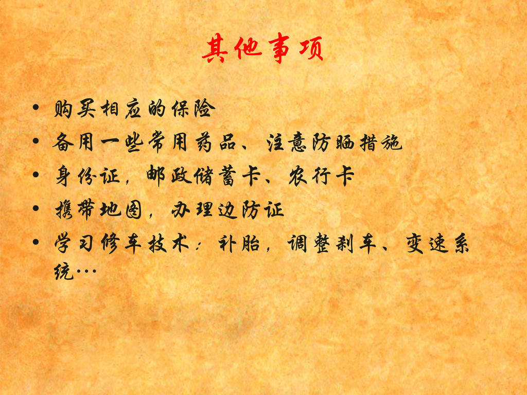 其他事项 • 购买相应的保险 • 备用一些常用药品、注意防晒措施 • 身份证,邮政储蓄卡、农行卡 • 携带地图,办理边防证 •