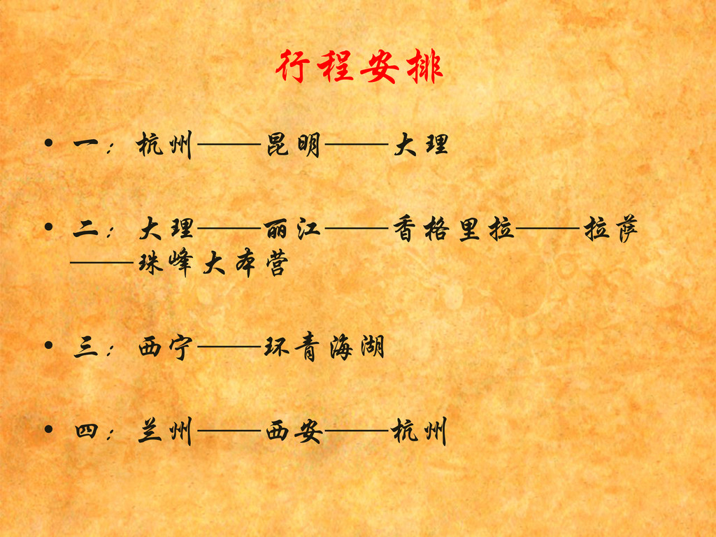 行程安排 • 一:杭州——昆明——大理 • 二:大理——丽江——香格里拉——拉萨 ——珠峰大本营 • 三:西宁——环青海湖 • 四:兰州——西安——杭州