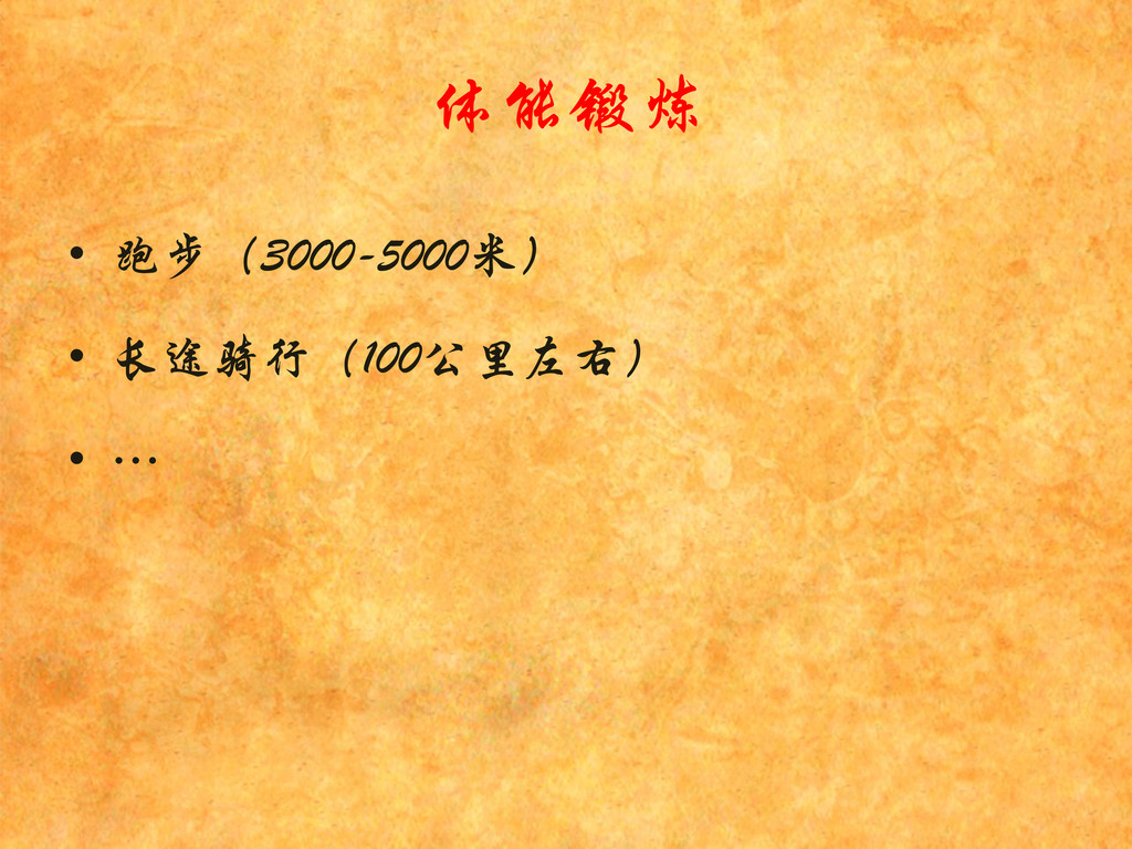 体能锻炼 • 跑步(3000-5000米) • 长途骑行(100公里左右) • …