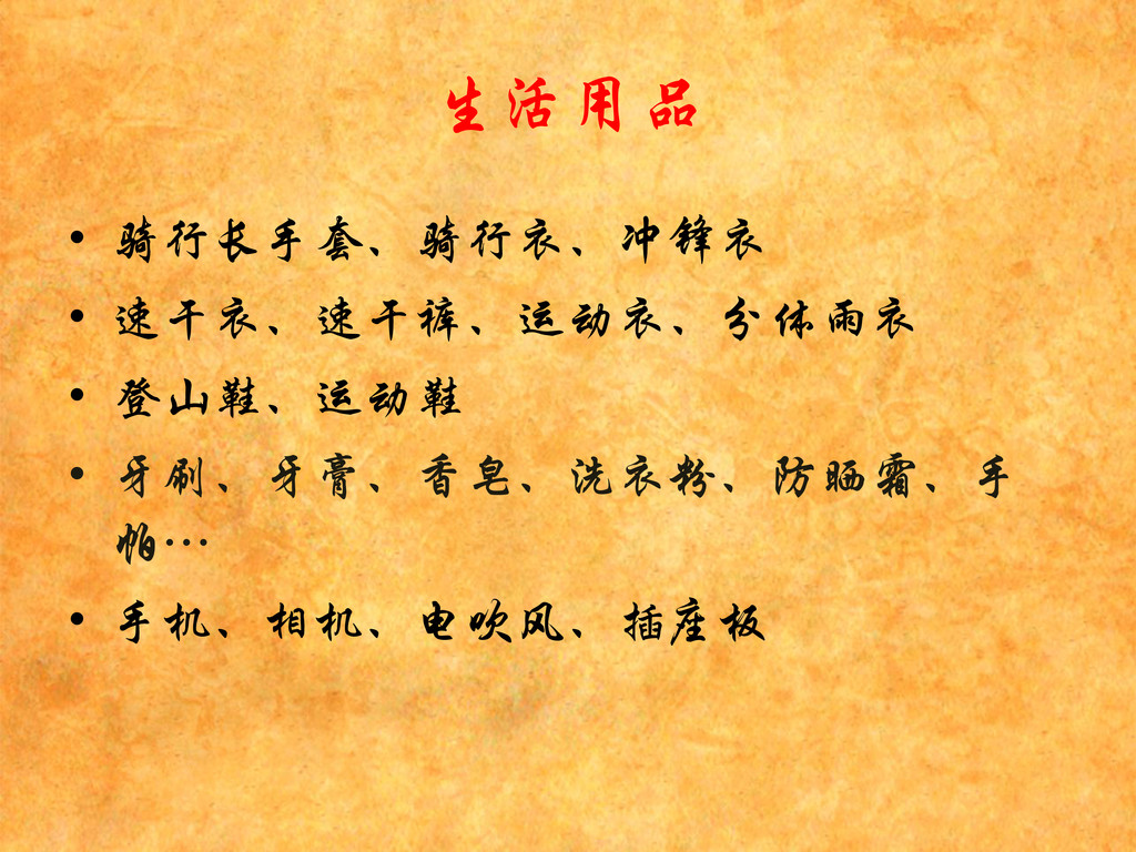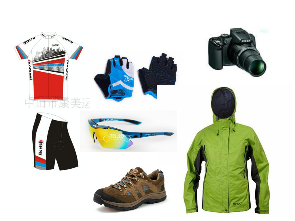 生活用品 • 骑行长手套、骑行衣、冲锋衣 • 速干衣、速干裤、运动衣、分体雨衣 • 登山鞋、运动鞋 • 牙刷、牙膏、香皂、洗衣粉、防晒霜、手 帕…