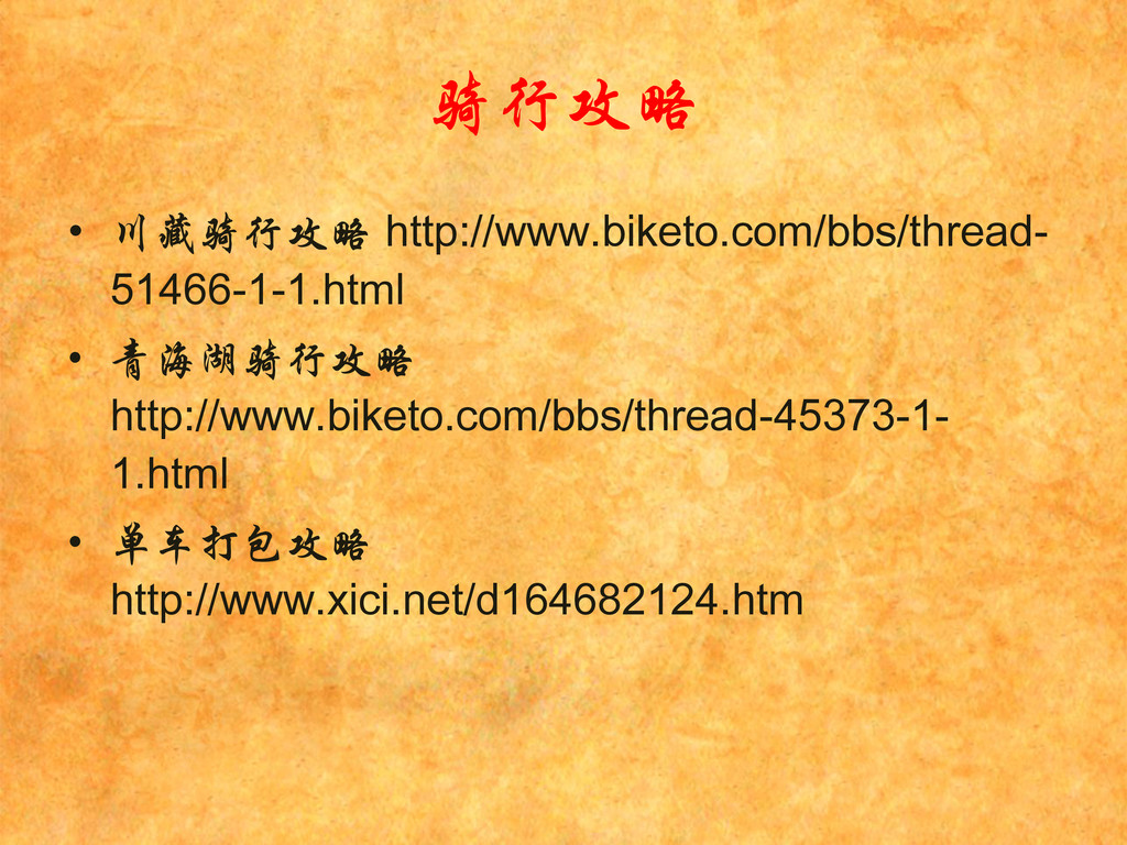 骑行攻略 • 川藏骑行攻略 http://www.biketo.com/bbs/thread- 51466-1-1.html • 青海湖骑行攻略 http://www.biketo.com/bbs/thread-45373-1- 1.html •