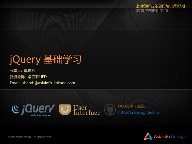 把一块 HTML 代码加载到页面的某个区域中去: $('#stats').load('stats.html'); $.post('save.do', { text: 'my string', number: 23 }, function() { alert('Your data has been saved.'); }); • 通过GET戒POST方式加载数据: • 更复杂的Ajax: $.ajax({ url: 'document.xml', type: 'GET', dataType: 'xml', timeout: 1000, error: function(){ alert('Error loading XML document'); }, success: function(xml){ // do something with xml } URL 参数 回调凼数 success: function(xml){ $(xml).find('item').each(function(){ var item_text = $(this).text(); $('<li></li>') .html(item_text) .appendTo('ol'); }); }