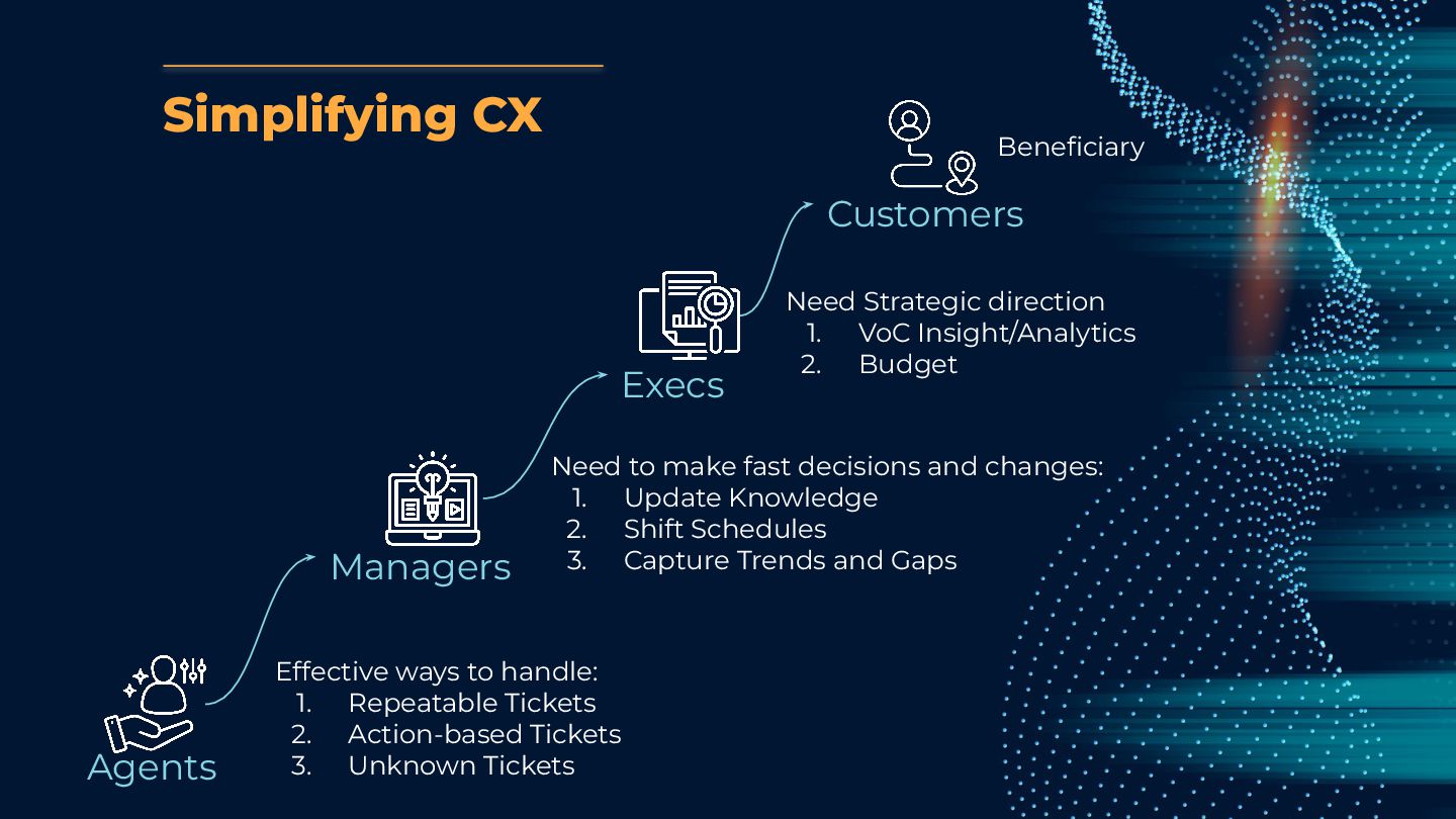 2. Action-based Tickets 3. Unknown Tickets Managers Need to make fast decisions and changes: 1. Update Knowledge 2. Shift Schedules 3. Capture Trends and Gaps Execs Need Strategic direction 1. VoC Insight/Analytics 2. Budget Customers Beneficiary