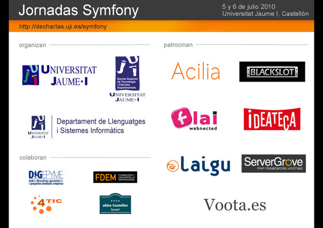 • symfony project:freeze • ant + symfony = Despliegue reducido a un comando • databases.yml y app.yml • Documentación excelente: • Abundante: Reference Book, Jobeet, primeros pasos. • Teórica y práctica. • En español e inglés. • Actualizada • Comunidad activa: blog, foros, Google Groups, … • Potentísimo framework de formularios. Validadores personalizables. Jornadas Symfony http://decharlas.uji.es/symfony