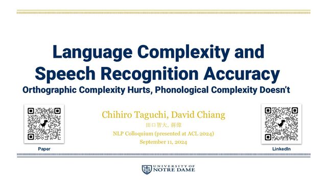 This deck contains the slides used in my presentation titled "Language Complexity and Speech Recognition Accuracy: Orthographic Complexity Hurts, Phonological Complexity Doesn’t" given at the NLP Colloquium on September 11, 2024 (JST). Images that might infringe copyright and privacy of others are removed in this version.