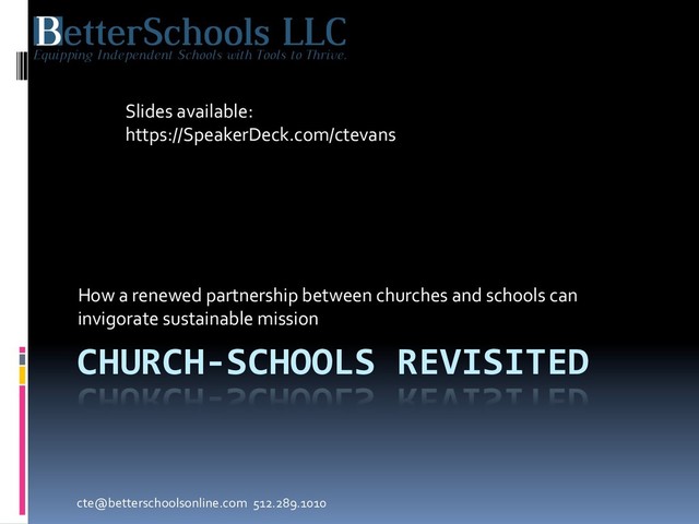 total ministry § Advocating for the legitimate benefits of Christian schooling § Appreciating parents’ educational choices § Embracing the church’s ministry involvement in public education § HoS as behind the scenes mediator in fellowship § Cheerleading for all ministries § Policy-level commitments to Christian school @ChuckBSLLC