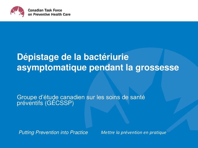 partie des soins prénataux de routine au Canada. • En 1994, le précédent Groupe d'étude canadien sur l'examen médical périodique a conclu qu'il y avait de bonnes preuves à l'appui d'une recommandation en faveur du dépistage de la bactériurie asymptomatique au début de la grossesse (12 à 16 semaines). • Le groupe d’étude actuel a jugé nécessaire de mettre à jour cette ligne directrice afin qu’elle tienne compte des données probantes sur les inconvénients et avantages potentiels du dépistage, et qu’elle tienne également compte des valeurs et des préférences des femmes. • Cette recommandation se concentre sur les femmes qui ne présentent pas de risque accru de bactériurie asymptomatique. 7
