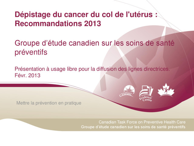 Health Care Groupe d’étude canadien sur les soins de santé préventifs Dépistage du cancer du col de l'utérus : Recommandations 2013 Groupe d’étude canadien sur les soins de santé préventifs Présentation à usage libre pour la diffusion des lignes directrices. Févr. 2013