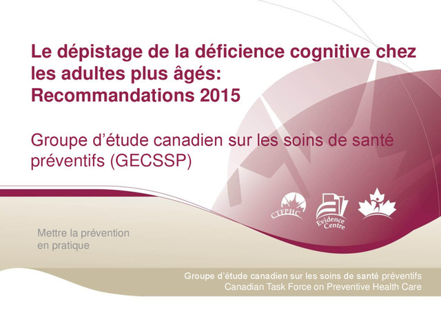 âgés: Recommandations 2015 Groupe d’étude canadien sur les soins de santé préventifs (GECSSP) Mettre la prévention en pratique Groupe d’étude canadien sur les soins de santé préventifs Canadian Task Force on Preventive Health Care