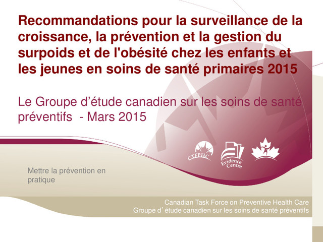 sur les soins de santé préventifs Recommandations pour la surveillance de la croissance, la prévention et la gestion du surpoids et de l'obésité chez les enfants et les jeunes en soins de santé primaires 2015 Le Groupe d’étude canadien sur les soins de santé préventifs - Mars 2015 Mettre la prévention en pratique