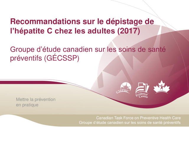 n'ayant jamais reçu de traitement, ≥ 18 ans, avec valeurs inconnues pour les enzymes hépatiques (Exclusions: patients post-greffe, patients avec VIH, patients hémodialysés, patients exposés dans le cadre de leur travail) Langues : Anglais et Français KQ1: Efficacité clinique KQ2: Inconvénients KQ3: Rentabilité KQ4: Préférences des patients KQ5: DTA Résultats Résultats à long terme: Mortalité dûe à l’infection au VHC, morbidité dûe à l’infection au VHC, Carcinome hépatocellulaire, transplantation hépatique ou qualité de la vie. Résultats intermédiaires: transmission du VHC, réponse virologique, changements de comportement pour améliorer les résultats de santé ou changements histologiques Sudiagnostic, surtraitement, faux- positifs, faux-négatifs, inconvénients reliés aux examens de suivi (incluant la biopsie), abus ou violence et anxiété Résultats d'analyse de rentabilité (ex. ICER, ICUR, CBR) ou résultats d’analyse de l’impact sur le budget La volonté d'être examiné et les facteurs considérés dans les décisions à examiner Résultats de DTA (ex. sensibilité, spécificité, valeur prédictive positive, valeur prédictive négative, rapport de vraisemblance, rapport de cotes (odds ratio) de diagnostic, ou ASC [aire sous la courbe]), taux de détection, nombre nécessaire pour détecter 1 cas. Type d’étude ECRs, études non- randomisées avec groupe de comparaison ou études de modélisation de la progression de la maladie ECRs, études non- randomisées avec ou sans groupe de comparaison ou études de modélisation de la progression de la maladie ECRs évaluations économiques et études de modélisation économique Études descriptives (sondages, qualitatifs) et études à méthodes mixtes Études transversales