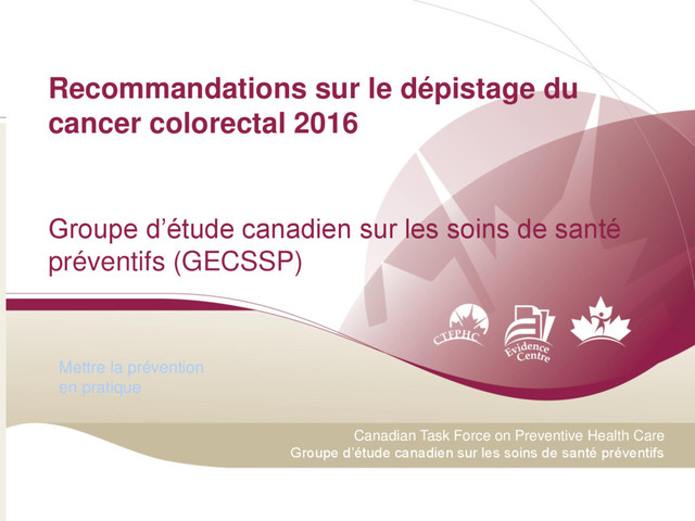 Health Care Groupe d’étude canadien sur les soins de santé préventifs Recommandations sur le dépistage du cancer colorectal 2016 Groupe d’étude canadien sur les soins de santé préventifs (GECSSP)