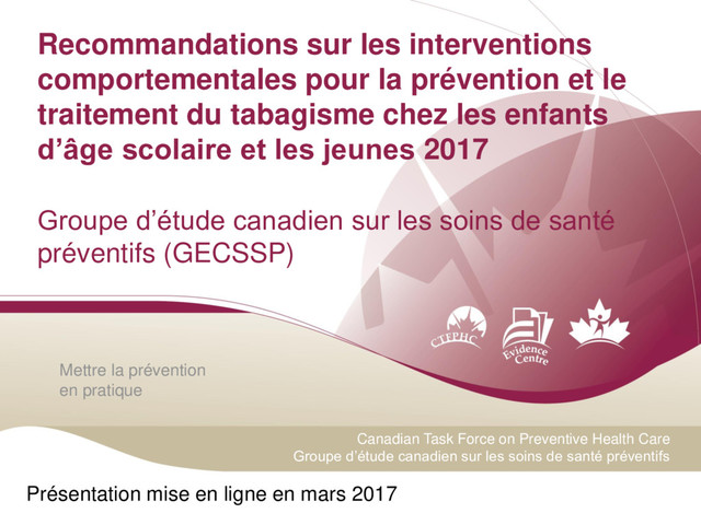 Health Care Groupe d’étude canadien sur les soins de santé préventifs Recommandations sur les interventions comportementales pour la prévention et le traitement du tabagisme chez les enfants d’âge scolaire et les jeunes 2017 Groupe d’étude canadien sur les soins de santé préventifs (GECSSP) Présentation mise en ligne en mars 2017