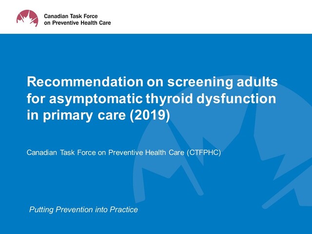 of Health Routine thyroid function testing is not recommended in asymptomatic adults. However, testing may be indicated when non-‐specific signs and symptoms are present in patients at risk for thyroid disease. Considering the high prevalence of thyroid disease, particularly hypothyroidism in women, and the fact that some studies have shown that affected women may benefit from early treatment, it is recommended that clinicians maintain a high index of suspicion and investigate individuals with vague symptoms that could be related to thyroid dysfunction. Toward Optimized Practice Do not test patients who are asymptomatic, seemingly healthy, having a periodic exam. United States Preventive Services Task Force The United States Preventive Services Task Force concludes that the current evidence is insufficient to assess the balance of benefits and harms of screening for thyroid dysfunction in nonpregnant, asymptomatic adults. American Thyroid Association and American Association of Clinical Endocrinologists Screening for hypothyroidism should be considered in patients over the age of 60. This recommendation was downgraded because there is strong evidence that hypothyroidism is common in this group but insufficient evidence of benefit or cost effectiveness.