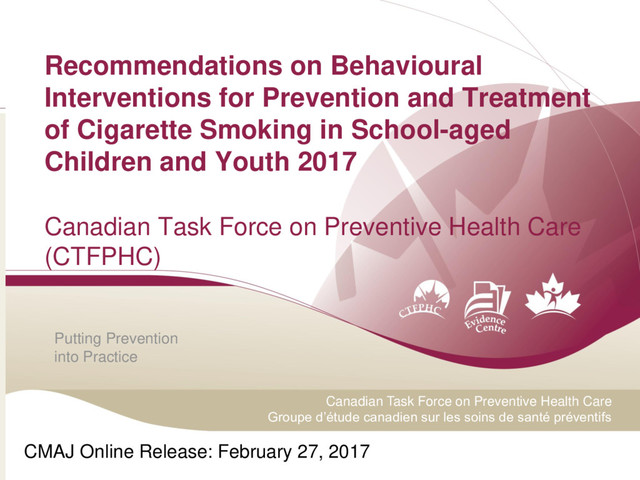 Care Groupe d’étude canadien sur les soins de santé préventifs Recommendations on Behavioural Interventions for Prevention and Treatment of Cigarette Smoking in School-aged Children and Youth 2017 Canadian Task Force on Preventive Health Care (CTFPHC) CMAJ Online Release: February 27, 2017