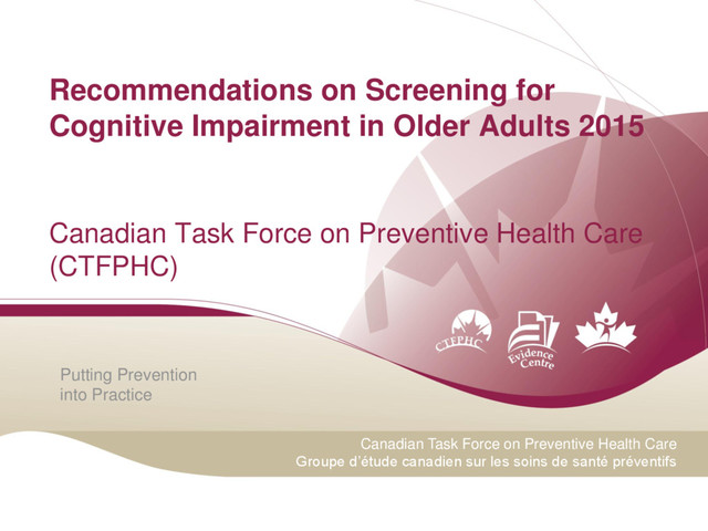 Care Groupe d’étude canadien sur les soins de santé préventifs Recommendations on Screening for Cognitive Impairment in Older Adults 2015 Canadian Task Force on Preventive Health Care (CTFPHC)