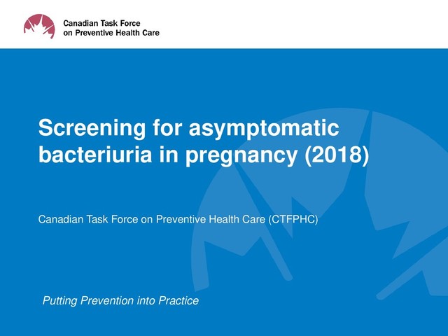 Task Force on Preventive Health Care (current) We recommend screening pregnant women once during the first trimester with urine culture for asymptomatic bacteriuria (weak recommendation; very low- quality evidence). This recommendation applies to pregnant women who are not experiencing symptoms of a UTI and are not at increased risk for asymptomatic bacteriuria. United States Preventive Services Task Force (2008) USPSTF recommends screening for asymptomatic bacteriuria with urine culture for pregnant women at 12 to 16 weeks gestation or at their first prenatal visit, if later. Grade A: The USPSTF recommends the service. There is high certainty that the net benefit is substantial. NICE, UK (2016) Women should be offered routine screening for asymptomatic bacteriuria by midstream urine culture early in pregnancy. Identification and treatment of asymptomatic bacteriuria reduces the risk of pyelonephritis. SIGN, Scotland (2016) Standard quantitative urine culture should be performed routinely at first antenatal visit (Grade A).